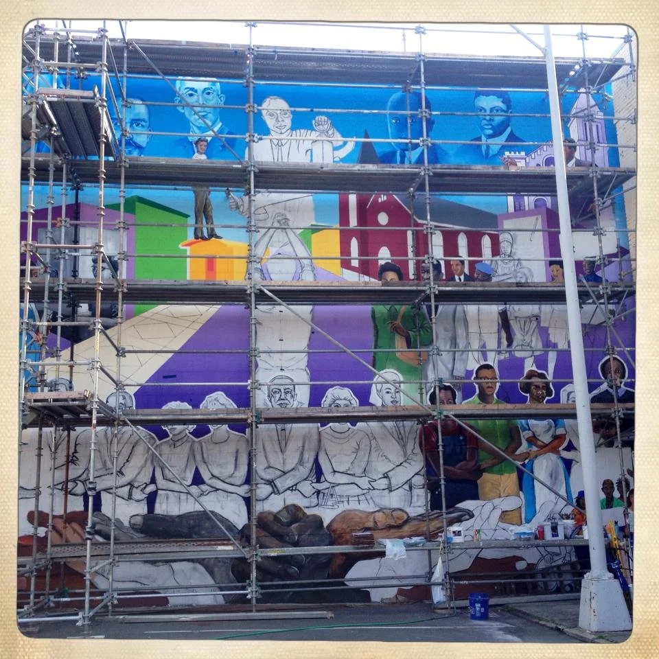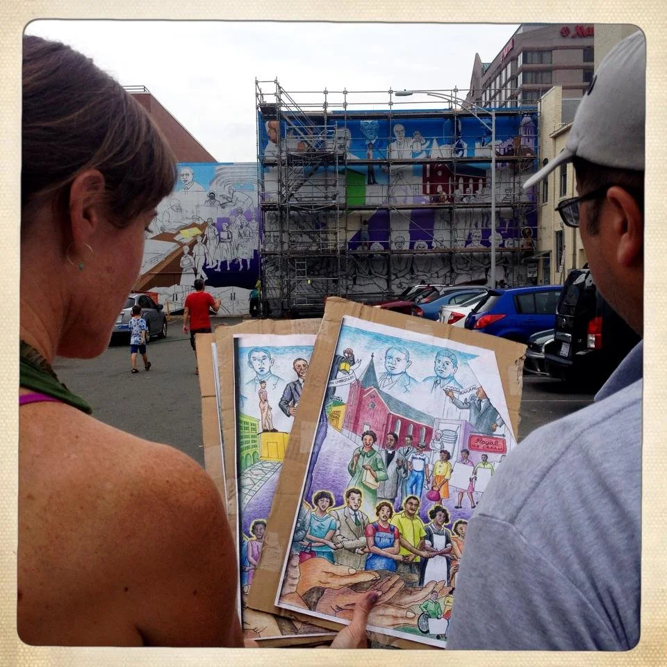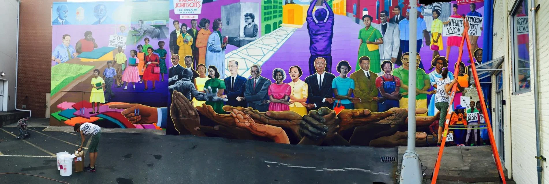 Beginning in 2013, 30 diverse community members, ages 15-65, came together during a 16-week period to engage in Durham’s Civil Rights History through a series of lectures, music performances, research and design workshops. The group then gathered what they discovered into a collaborative mural design. In 2014 these same folks, with the help of the greater community, painted a 2400 square foot mural in downtown Durham, under the direction of muralist Brenda Miller Holmes and documented by Rodrigo Dorfman.